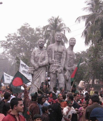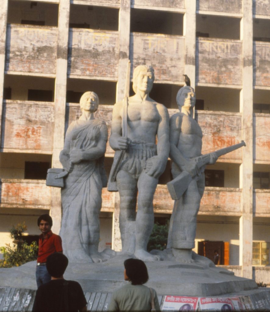 解放戦士 3 人の像《オポロジョヨ・バングラ(征服されざるベンガル)》は、バングラデシュの独立戦争を記念した公共彫刻として、もっとも広く知られる作品であろう。ダッカ大学文学部の前に立つ高さ6mほどの立像は、彫刻家サイード・アブドゥッラー・カリッド(Syed Abdullah Khalid、1945-2017)が手がけた作品である。(図1)