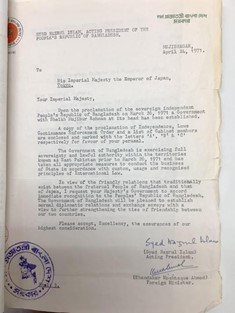 (1)4月17日、ムジブナガル*でバングラデシュの独立と臨時政府の樹立を宣言する式典が行われた。時をおかず、バングラデシュ臨時政府のヌズルル・イスラム大統領代行より天皇宛てにバングラデシュ独立を伝える書簡が日本外務省に届いた。各国元首に同一内容の書簡が発出されているようであった。